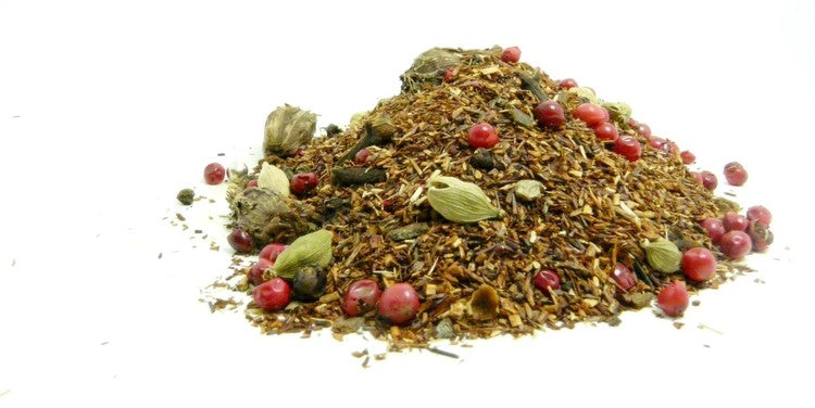Pyszny napój z czerwonej herbaty rooibos z kardamonem, cynamonem, goździkami, różowym pieprzem i aromatami. Wyobraź sobie mieszankę o słodkim aromacie harmonijnie połączonym z musującymi nutami przypraw. Bogaty, bujny napój, którym delektujemy się przez cały rok. Czerwona herbata pochodzi z Afryki i nie zawiera teiny. Jest doskonałej jakości, o intensywnym czerwonobrązowym kolorze, o wyrafinowanym, słodkim smaku i wyjątkowym zapachu. Uważamy, że dodawanie cukru i innych substancji słodzących do czerwonej herbaty jest zbędne, ponieważ sama w sobie jest słodka, bogata, intensywnie smaczna i przyjemna. To herbata, która długo przechowywana nie traci swojego unikalnego aromatu. W porównaniu z innymi rodzajami herbat zawierających teinę, czerwona herbata rooibos jej nie zawiera, co daje nam tę zaletę, że możemy ją pić na ciepło lub na zimno o każdej porze dnia.
