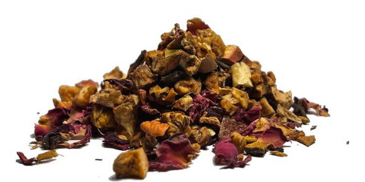 Pyszny napój z czerwoną herbatą rooibos, jabłkiem, kwiatami hibiskusa, skórkami granatu, skórkami cytryny, ramnosem, cynamonem, goździkami i aromatami. Wyobraź sobie mieszankę o słodkim aromacie harmonijnie połączonym z musującymi nutami owoców i kwiatów. Bogaty, bujny napój, którym delektujemy się przez cały rok. Czerwona herbata pochodzi z Afryki i nie zawiera teiny. Jest doskonałej jakości, o intensywnym czerwonobrązowym kolorze, o wyrafinowanym, słodkim smaku i wyrazistym, niepowtarzalnym zapachu. Uważamy, że dodawanie cukru i innych substancji słodzących do czerwonej herbaty jest zbędne, ponieważ sama w sobie jest słodka, bogata, intensywnie smaczna i przyjemna. To herbata, która długo przechowywana nie traci swojego unikalnego aromatu. W porównaniu z innymi rodzajami herbat zawierających teinę, czerwona herbata rooibos jej nie zawiera, co daje nam tę zaletę, że możemy ją pić na ciepło lub na zimno o każdej porze dnia.